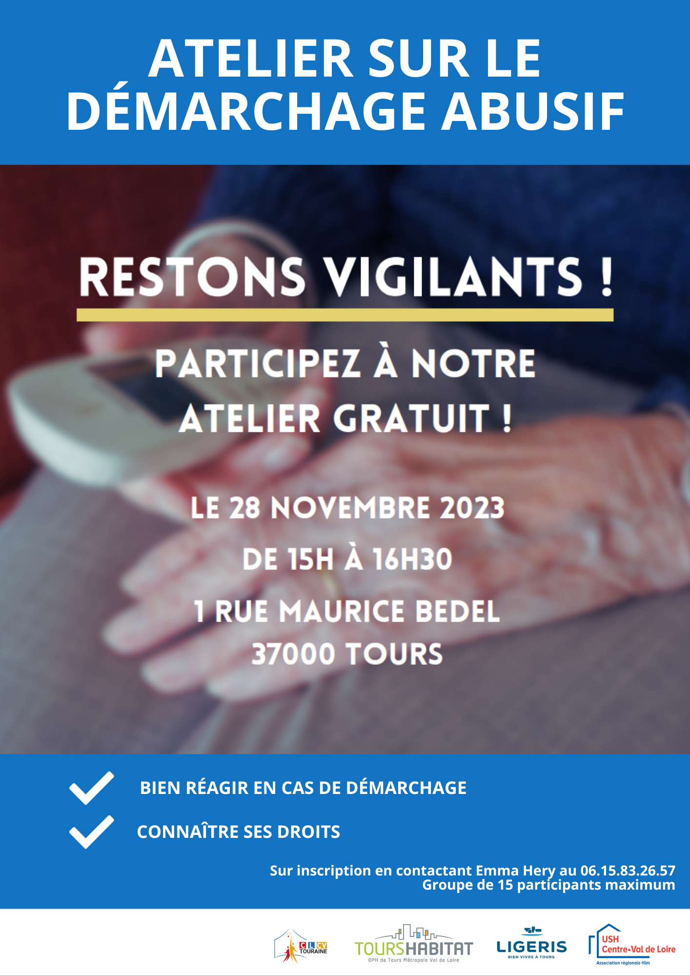 Les inscriptions sont encore possibles pour l’atelier sur le démarchage abusif organisé mardi 28 novembre de 15h à 16h30 au siège de TOURS HABITAT (1 rue Maurice Bedel – 37000 TOURS). Contactez Emma au 06.15.83.26.57 📞